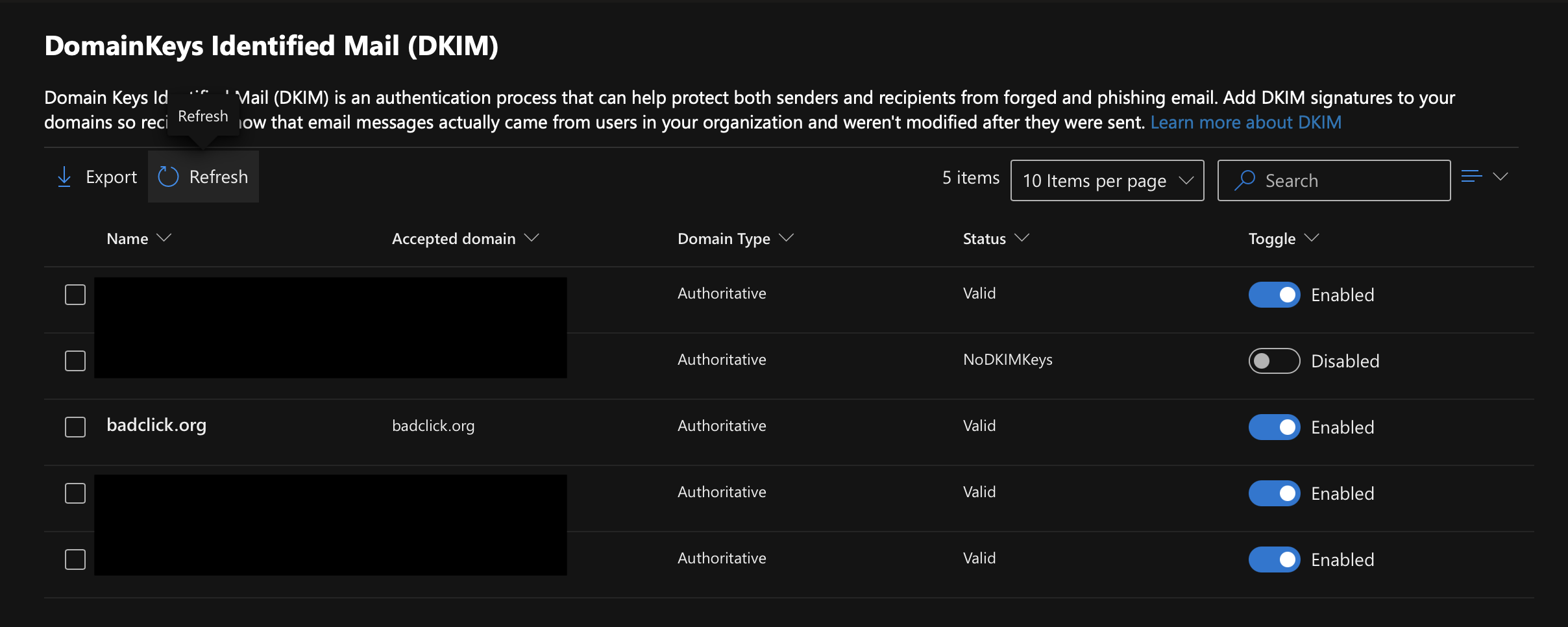 Once these records propagate, you can enable DKIM signing from the Microsoft 365 Security & Compliance Center.