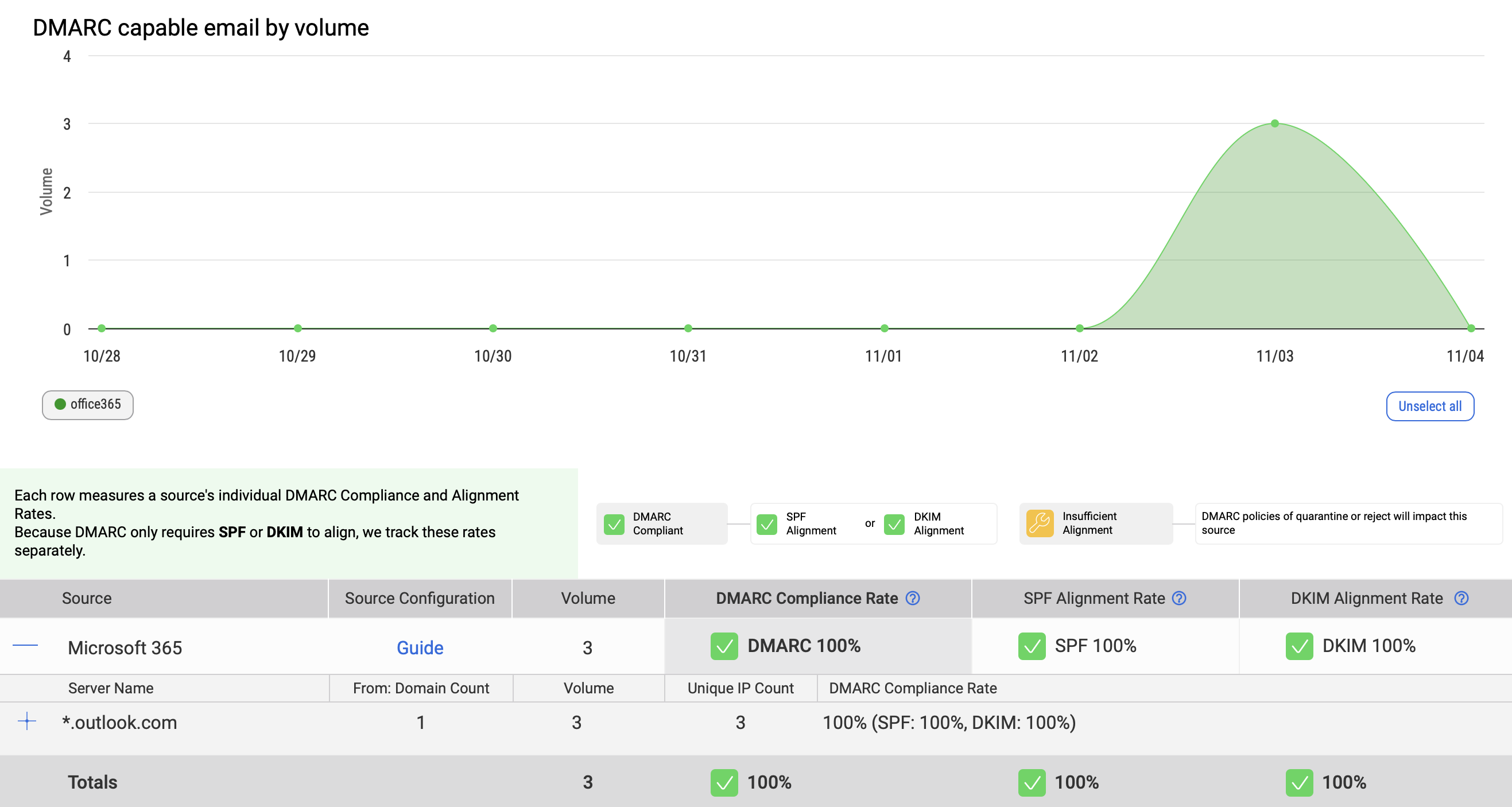After about 24 hours, I started receiving daily XML reports from dmarcian showing data from Gmail, Yahoo, and Microsoft recipients.