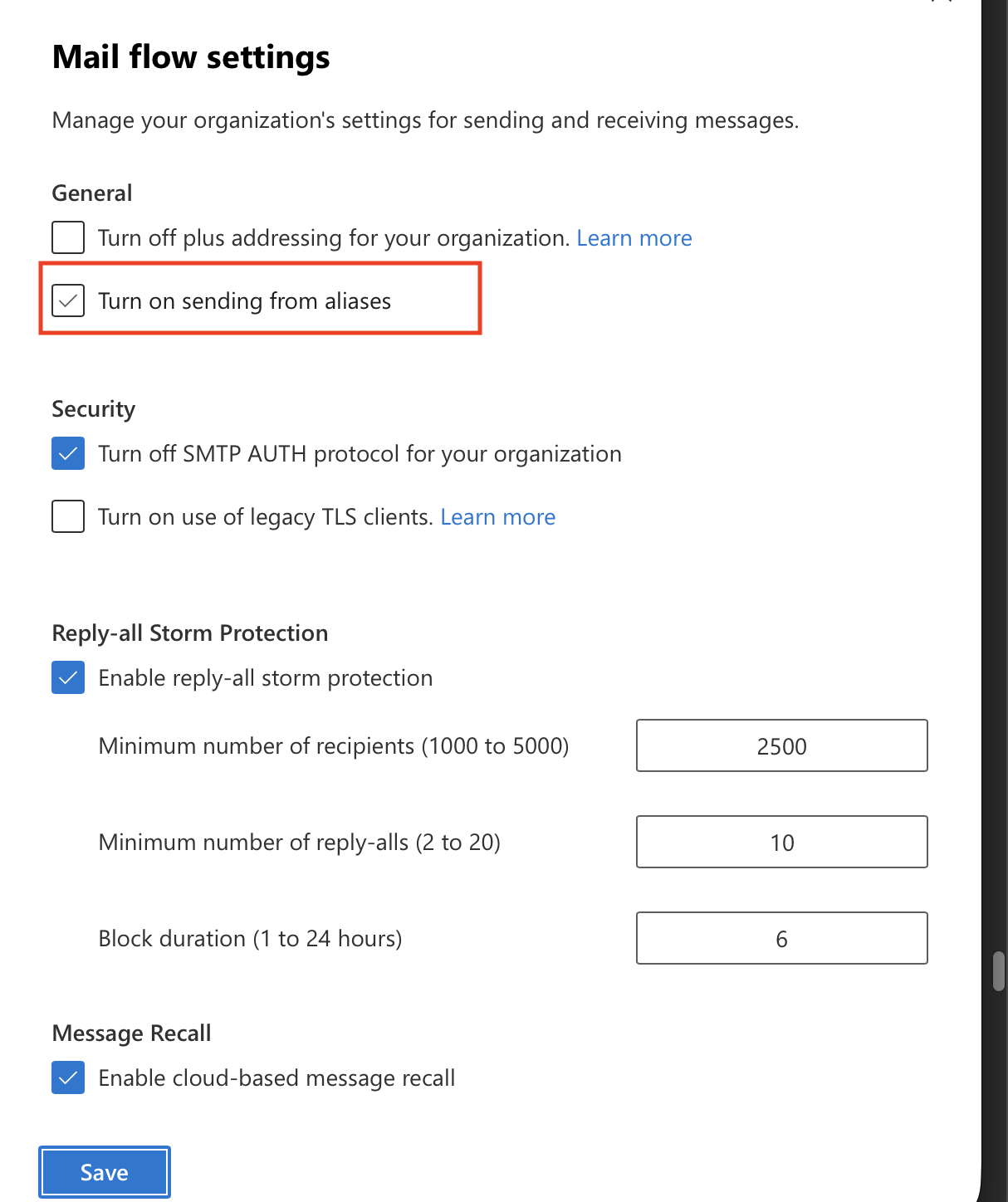 Since I host multiple domains, I also needed to enable sending from aliases in Microsoft 365.