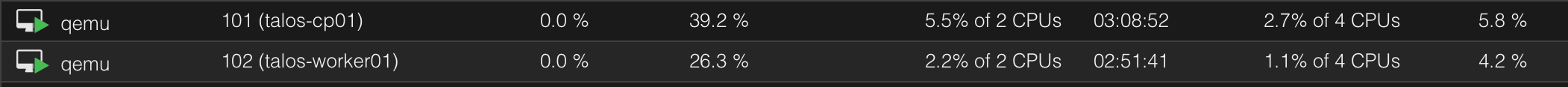 Control Plane | 2 | 4 GB | 30 GB | Talos + etcd + apiserver |