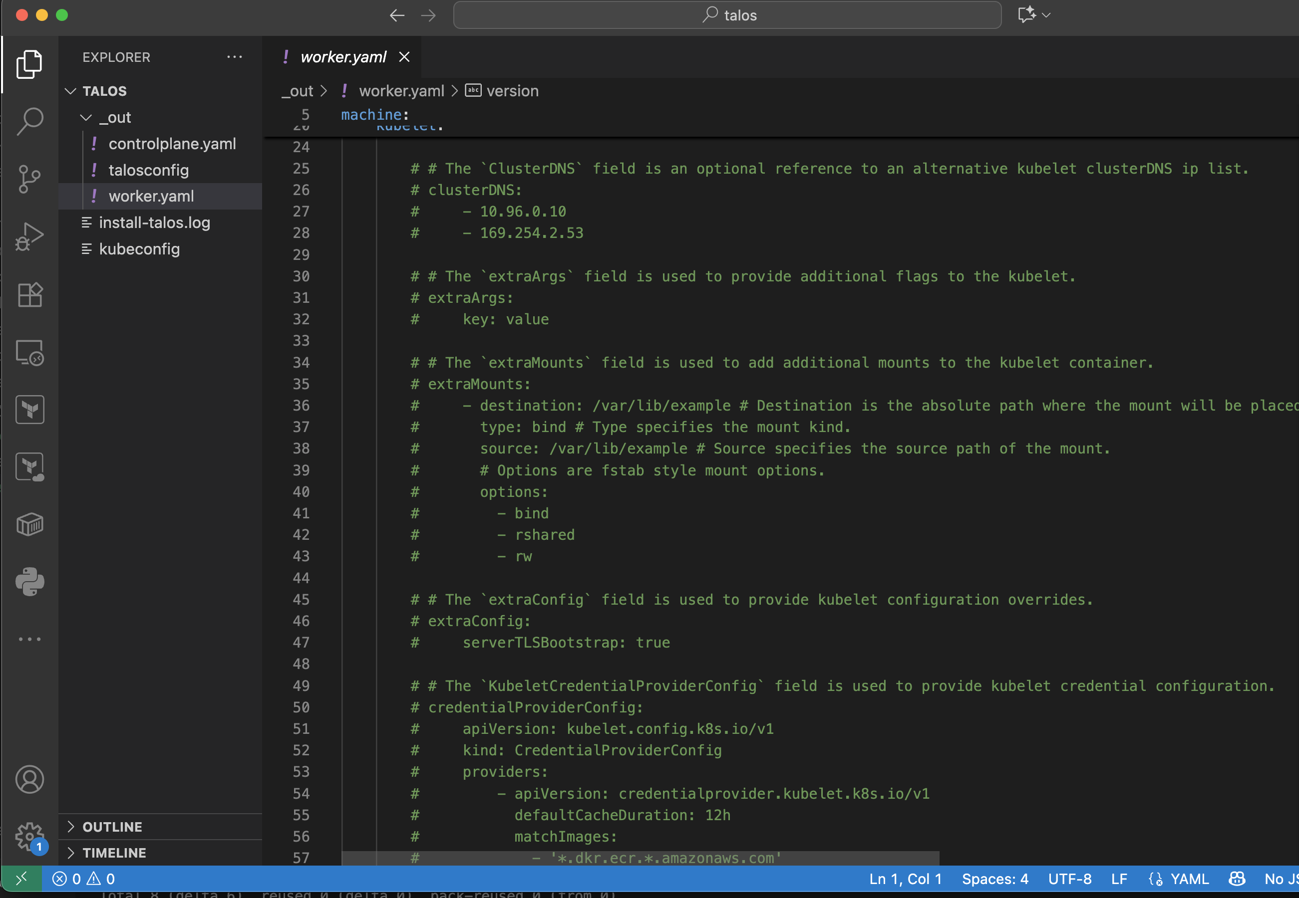 That gave me: • controlplane.yaml – control plane node • worker.yaml – worker node • talosconfig – local CLI config